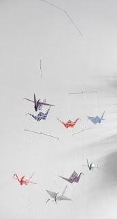 Tästä alkoi vauva-askartelut! Näpräilin Mujin origamipapereista kahdeksan lintua ja kiinnittelin ne siimalla rautalangasta taivuttamiin ripustuksiin. Jotain saman sorttista, olisiko ollut origamikaloista tehtyä, näin joskus Design Spongessa. Suoria rautalankatikkuja saa ainakin Hobby Pointin kukka-asetelma tarvikehyllystä. Chic!