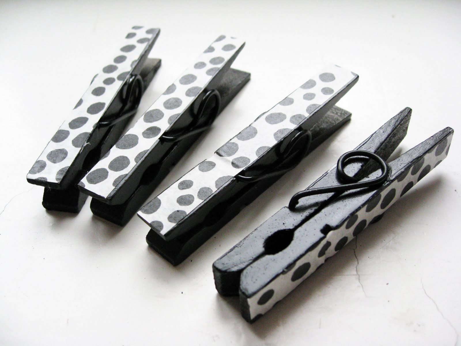 Ootteko miettinyt miksi tyylikkäät vaunut verhotaan niillä sideharsoilla? Itse ainakin vannoin, ettei meillä viritellä mitään rättejä, mutta kuinkas kävikään. Muutaman vauvanhoito-oppaan luettuani oli pakko myöntyä suojaaviin harsoihin, mutta pyykkipojille sentään mahdoin jotain. Sprayasin pojat mustiksi ja liimasin pintaaan Marimekon lahjapaperista palaset. Pintaan vielä spraylakka ja avot!