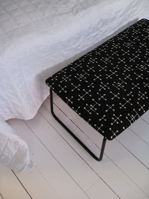 Dymon lisäksi rakastan Vitraa ja Eamesia. Voitin keväällä töissä “arpajaisista” rahin, joka nyt ei ihan sinällään ollut miun makuuni. Musta spraymaali pelasti jälleen sekä Maharamin unelmakangas, jota vielä sai tilattua Kvadratin kautta: Charles ja Ray Eamesin Small Dot Pattern (1947). Nyt kelpaa.