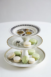 Tämäkin kerrosvati on jo vanhoja työaskarteluja, jonka idean löysin muistaakseni Design Spongen kautta. Niissä ei tainnut olla mitään söpöjä eläimiä kiinni, mutta minusta tuo koira sopii asustelemaan lautasella mainiosti. Lautasten välissä on keraamiset kynttilänjalka ja munakuppi. Rautakaupasta löytyi tosi ärtsyä liimaa, jolla pysyy vaikka norsu katossa. Muistaakseni Cascon Fit-it tai jotain sen suuntaista.