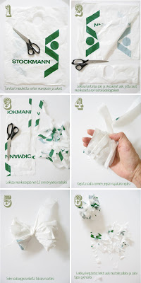 Purkkiprojektiin etikettejä etsiessä, törmäsin Creature Comfortsilla “muovikassiruusukkeen” teko-ohjeisiin. Pakkohan se oli heti testata ja paketoida yksi tuparilahja. Helppoa oli kuin mikä!