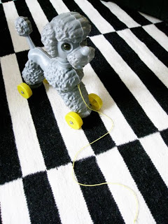 Mustasta ja valkoisesta syntyy harmaa (lelukoira). Pirtsakat renkaat kuitenkin alla. Ikeasta löytyi viime reissulla veikeä käärmemobile. Vaunuja koristaa vanha, kirpparilta varmasti jo 10 vuotta sitten löytynyt nallenauha. Aarre-astioita sain ihanilta työkavereilta Varpun Babyshowereissa. Näistä saa syödä vasta, kun homma alkaa olla hanskassa.