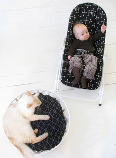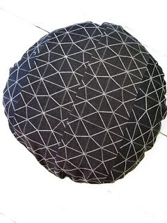 Kissat nukkuvat meillä yön eteisessä, koska läheisyyden kipeinä kömpisivät aina viereen, missä V nykyään nukkuu. Tähän saakka meillä oli kissoille suuri lattiatyyny, mutta se vei liikaa lattiatilaa. Päätin ottaa villasukkakorin uuteen tehtävään. Kaapista löytyi vanhaa kangasta, jossa on aivan sama kuviointi kuin itse korissa. Hauska yhteensattuma tuo graafisuus. Kangas on muistaakseni Kinnarpsin Mekano. No sitä ei sitten riittänyt ihan molemmin puolin vaan jouduin tyynyn alapuolen ompelemaan kangaspaloista, mutta hyvin kelpaa ja tulipahan käytettyä tehokkaasti jokainen pala. Meillä ei ollut tarpeeksi vanua, joten sulloin sisälle tavallisen nukkumishöyhentyynyn. Se muokkaantui sinne tosi hyvin.