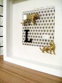 Sadepäivällä on hyvää aikaa askarteluun. Olin jo aiemmin ihastellut Riikan eläinaiheisia aakkostauluja ja tänään alkoi tapahtumaan. Ostin lauantaina Ikeasta taulua varten kehyksen ja tänään keräilin sitten askartelulaatikosta yhteensopivia aineksia. Minulta löytyi yhdestä vanhasta työjutusta jääneitä kultaisiksi maalattuja muovieläimiä sekä kivaa lahjapaperia, josta jo aiemmin tuunailin sen tikkuaskin. Mustasta foamista leikkasin sitten tuon L-kirjaimen. Soveltelin vähän tuota Riikan mallia. Miulla leijona sai vielä puhekuplan, kuinka se ärjyy.