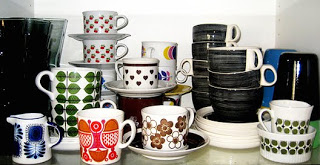 Olen silloin tällöin luetellut asioita, joita minun mielestä ei ole kotona koskaan liikaa. Yksi on villasukat, toinen sokerikot ja mausteikot ja kolmas heikkouteni on vanhat käyttöastiat. Mieluiten 1950 ja 1960 -luvuilta, koska niiden graafinen kuviomaailma on vaan niin tyylikästä. Usein parhaat ovat pohjoismaalaisista keramiikkatehtaista: Arabia, Rörstrand, Gustavsberg jne.