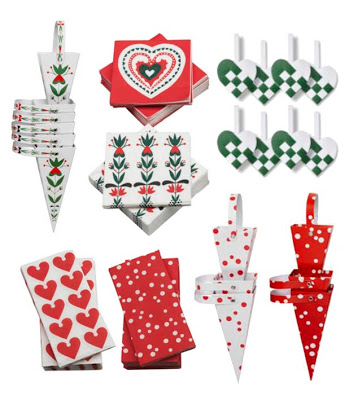 Ikeassa oli muutama jouluinen ihanuus, jotka voisivat päästä joulupöytäämme. Huomatkaa muuten uudet suorakaideservetit. Noita sydämiä tai pahvitötteröitä ripustaisin valkoisiksi maalattuihin oksiin ja pistäisin maljakkoon. Korvaisi ne kimalleruiskutetut ja kirjavaan rottinkikoriin istutetut minikatajat.