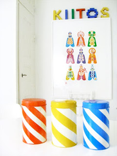 Sunnuntain kirpparilla pikkusiskoni oli myymässä näitä purkkeja pois. Pakkohan ne oli pelastaa talteen. Ihanuuksille vaan ei ole tällä hetkellä mitään paikkaa (minkä sisko sanoi jo ostohetkellä, heh). Näin ne jo Vn huoneen piirustuspöydällä kynille ja muulle pikkutilperöörille. Ennen kun Vlla on edes sitä huonetta, niin nököttäköön nyt tuossa keittiönpöydällä. Yhteenhän voisi laittaa vaikka herkkumysliä, toiseen ja kolmanteen…öööh. Kauniit kaikesta tarpeettomuudestaan huolimatta. Minulle tulee mieleen sirkus, karkkikepit ja barber shop.
