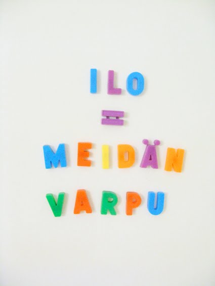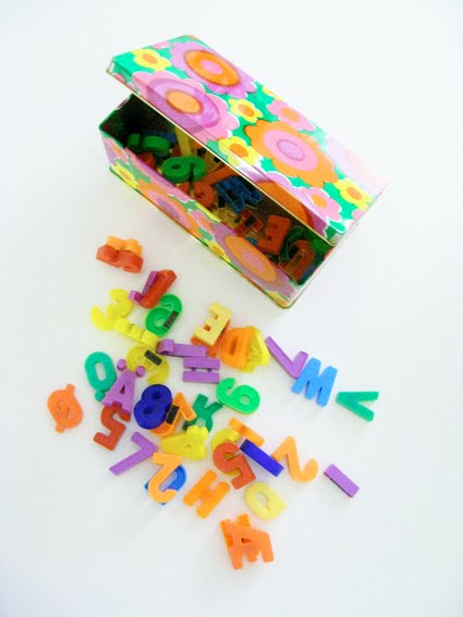 Mukaanhan tarttui tietenkin kaikkea muutakin, kuten tuo söötti kukallinen peltiboksi, 1 e ja pussillinen magneettiaakkosia ja -numeroita, 1 e. V tarvitsee hyvin pian oman huoneen tai meidän koti alkaa näyttää yhdeltä isolta lastenhuoneelta.