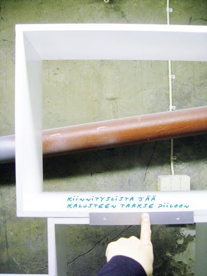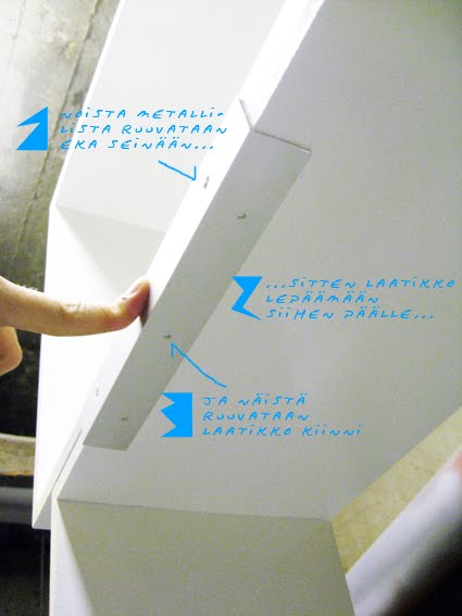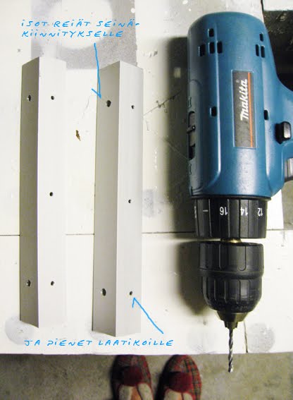 Tänään leikin insinööriä ja kehittelin seinälaatikoille näkymättömän ripustuksen. Joku joskus kysyikin mitenkä ajattelin nämä laittaa seinälle – tässäpä resepti, kassotaan kuis toimii. Ja siis listoja tulee 3 kpl koko laatikkotorniin.