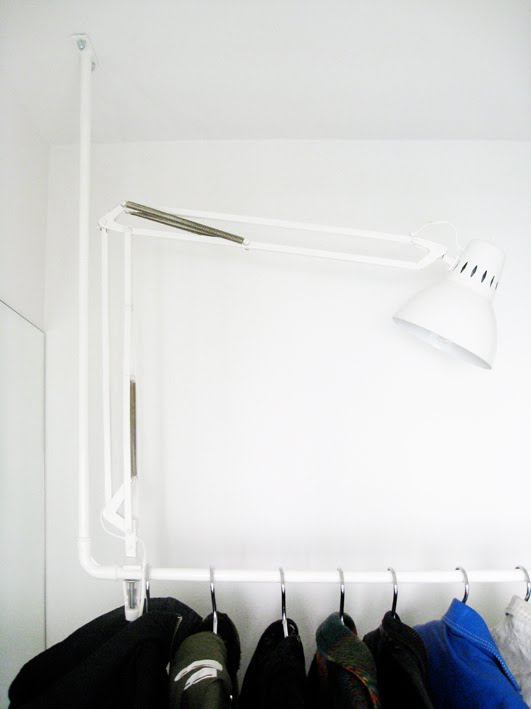 Need to write little bit anyway…I am so in love with our need coat hanger. I draw it some time ago when we lived at grandmother’s place (renovating time). I wondered and measured warmer’s water pipes there and drawed some plans of this. I went to see a welder with a plan and he said – No problem!  I paint it white and added old table lamp which I also paint to white and here it is now. Cool hanger!
