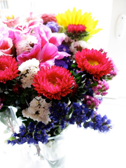 Ystävä kävi eilen kylässä ja toi ihanan kimpun. Ah tätä värien määrää. Iltapäivällä lähdettiin sitten shoppailemaan joululahjoja (eikö olekin ärsyttävän aikaista, heh). Museokaupoista tuli niin kivoja juttuja vastaan, että ostin nyt jo odottamaan tuonne kaappiin. Tietenkin jotain piti saada itsellekin. Uusi Moleskine ehkä innoittaa töihin paluuta ja Fledstedin Harlekiini-mobile oli kuin tehty meille. Niin ja posteljooni toi uuden jatkojohdon. Ei nyt haittaa piuhat lainkaan.