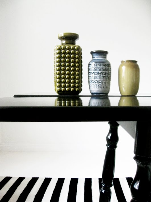 Rakastan rumia maljakoita. Niitä 1960 ja -70 lukujen kammotuksia, joita kukaan muu ei huoli kirpparihyllyiltä. Valuvia ja röpelöitä lasitteita, vasurilla tehtyjä kuviointeja sun muuta. Meille saa tulla mun puolesta vaikka kaikki. Nämä olen joskus hankkinut kirppareita yhtä kuvausta varten ja miellyttävät silmääni edelleen. Hauskintahan on sitten kooklailla niitä pohjaleimoja ja jännittää onko oman vaasin arvo vaikka 1 000 euroa. No ei ole. Mutta selvisi, että tuo sininen W. Germany leimalla varustettuna on Scheurich-keramiikkaa ja kyllä siitä useamman kympin voi saada eBayssä. Tuskin on ostajia. Ellei nyt muitakin rumaa rakastavia löydy.