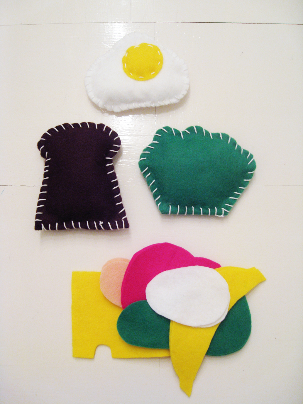 Työkaverini kertoi tehneensä joskus tyttärelleen leikkiruokia huovasta. Meillä kokkaillaan jo ihan hulluna, joten kiitos J vinkistä. Nyt meillä voidaan jo paistaa muna ja tehdä salaattileipä sen kanssa. Huomenna lisukkeeksi tulee nakki, keitetty muna, omena, päärynä ja juustoviipale.