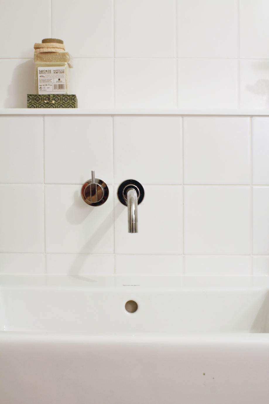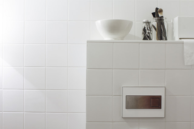 Kylpyhuonekin on jo peiliä vaille valmis, mutta valoa niin vähän, etten saa ilman jalustaa kunnon yleiskuvaa. Tässä kuitenkin ulokkeilta otetut lähikset, jotta päästään vähän tunnelmaan. Oikein hyvä kyllä tuli ja itse asiassa tuo wc:n koroke on osottautunut korvaamattomaksi säilytystilaksi kaikesta nurinasta huolimatta. Ei ole edes tilaa simpukoille.