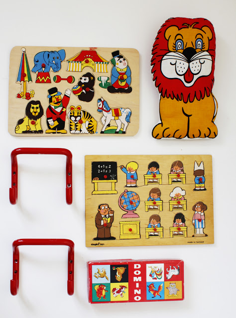 Oltiin Varpun kanssa aamulla lelujen ostomatkalla Vallilassa. Valtterista löytyi vinkeä leijona, domino ja äidille muutama vanha räsymatto parvekkeelle. Flemarilta ostimme puupalapelit, joita meillä on kohta jo liikaa. Sieltä löytyi myös 1975-koukut niin trendikkään punaisina. 5 e/kpl, myyjä tiesi mitä möi, mutta kohtuuhinta kuitenkin. Kunhan isi tulee reissusta, pistetään koukut eteiseen ja sitten lisää kuvia.