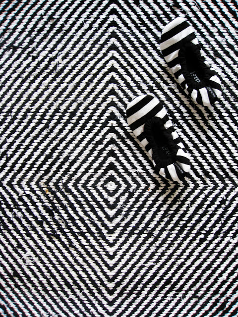 V sai mupulta (mummopuoli) ihanan uuden maton! On hän niin taitava. Äiti osti eilen tossut sävy sävyyn. Perinteiset jumppatossut perinteisesti raidallisena. Hyvä Marimekko.