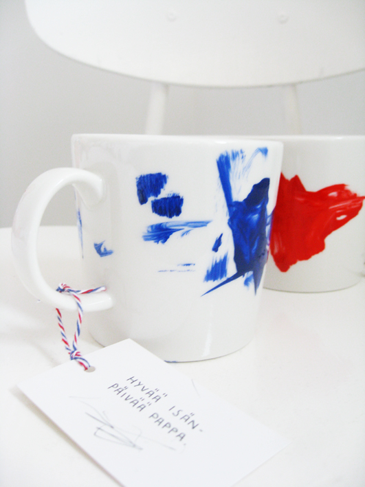 2. mette, those are painted with porcelain colors with brush. Three days drying and then to owen in 30 min. after it those can be washed in dishwasher…tiimarista löytyi posliinimaalit. Maalataan siveltimellä, kuivatetaan kolme päivää ja sitten poltto kotiuunissa. Kestää sen jälkeen astianpesukonettakin.