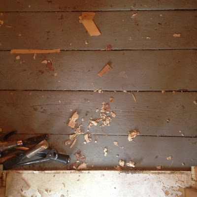 Nyt on ensimmäinen työntäyteinen mökkiviikonloppu takana. Intensiivikurssilla on tutustuttu 1929 siirretyn hirsitalon rakenteisiin ja todistettu että kun tarpeeksi purkaa, niin tulee maa vastaan. Visioni uusista lattialankuista, pienestä maalauspuuhasta ja tapetoinnista vaihtui nyt ainakin eteisen suhteen ihan alapohjan uudelleen rakentamiseen. Keittiöstä saatiin jo purettua vanha yläkaappi ja lastulevykomeroita, joka vielä tuossa kuvassa jöllöttää.