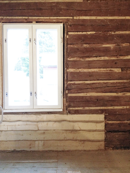 Juu ei ole vielä tiedossa raikkaan valkoisia ja kepeästi kukkivia sisustuksia vaan hyvä pala arkirealismia mökkeilyn maailmasta. Projekti etenee varmasti, mutta aikasta hitaasti. Pelkkä viikonloppu ei meinaa riittää mihinkään, varsinkin kun useampi homma viekin kuviteltua enemmän aikaa. Viikon aikana oli käyty kuivat lahot korjaamassa ja päädyimme ns. lankuttamiseen. Se on nopeampaa, edullisempaa ja varsin käyttökelpoinen tapa, jos hirret eivät jää näkyviin, meillä kun pintaan palaavat halteksit jossain vaiheessa.