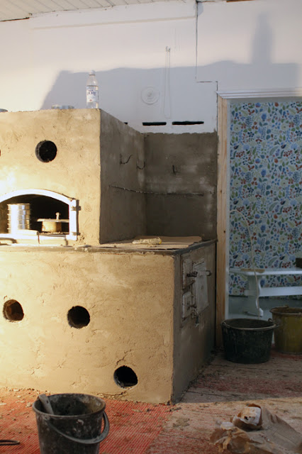 Hullut viikonloput takana ja näyttäisi siltä, että pääsemme kuin pääsemmekin joulun viettoon maalle. Ei suinkaan täysin valmiiseen tupaan, mutta sellaiseen, jossa voi jo juhlan viettää. Makuuhuone on lattialistoja vaille valmis, tuvassa jatkuu remontti jälleen joulun jälkeen. Lattioita ei ehditä maalaamaan ennen aattoa, mutta sisustetaan nyt tupa juhlaan ja palataan aherrukseen loppiaisen jälkeen. Nyt on kaikki seinät haltexoitu, tapetoitu, mökki sähköistetty ja tuvan uusi lautalattia asennettu. Eteinen on paneloitu loppuun ja sen katto pohjamaalattu. Uuninkorjaajakin piipahti menneenä viikonloppuna ja uskomattoman hyvää työtä tuli. Nyt on uuni korjattu ja kunnostettu toiveiden mukaiseksi: vanha ylhäältä päin täytettävä tulipesä vaihdettu sivusta aukeavaan, liesi siirretty vanhan aukon tilalle ja loppupätkä tasoitetaan vielä betonilla, niin saadaan samaan tasoon loppumatkaksi hyvä iso pannunalusta. Uuni tasoitettiin sunnuntaina ja nyt se kuivuu hissun kissun viikon ajan. Laasti vaalenee kuivuessaan, joten lopullinen väri on nähtävissä sitten aaton alla. Keittiön takaseinä sai myös laatat. Hirsien päälle ensiksi koolaus, sitten laattalujalevy, vesieristys ja laatoitus (jonka tein elämäni ensimmäisen kerran ja you tuben avustuksella, ja kyllähän tuo taisi onnistua. Saletisti helpompaa, jos seinät ja katot olisivat suoria, mutta nyt mentiin näillä). Tulevana viikonloppuna vielä saumaus, niin se alkais olla siinä.