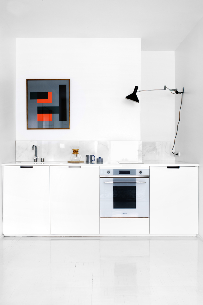 Tein uusimpaan Dekoon jutun tästä rakkaasta aiheesta ja siinä esiteltiin myös meidän keittiö. Ja vaikka keittiö olisi kuis toimiva, kyllä se välillä kaipaa päivitystä. Laitettiin välitilaan marmorilaatat ja vaihtuva taidenäyttely sai Playtypen uuden julisteen. Marmorilaatat hankittiin Kaakelikeskuksesta ja mikä parasta juuri senttienpäälle mentäessä – keraamisella laatalla mahtuu hyvin tuonne hanan ja seinän väliin, kun perinteiset kivilevyt olisivat olleet liian paksuja.