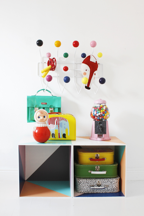 Tuosta makuuhuoneen aikuistumisesta jäi jäljellle entiset yöpöytämme, maalatut Palaset-laatikot. Olin löytänyt ne aikanaan pilkkahintaan Aino-kirpputorilta ja maalasin ne erääseen työjuttuun Tikkurilan Empire-maaleilla. Muovikuutioille eka maalipesu, pieni hionta ja sitten kahteen kertaan kuvioiden maalaus/väri. Aikamoista askartelua ja maalikerrosten kuivumisia, mutta viikossa tuli valmiiksi.