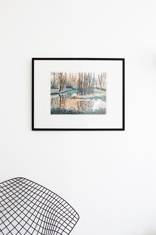 Tämä valo on ihanaa. Ja vallankin se, että siitä voi nauttia vielä viidentoista jälkeen. Sain kuvattua nyt sen kirppistauluhankintani. Samarian seinältä voi löytää mitä vaan, vaikka täydelliset värit ja silmää miellyttävän grafiikan jäljen. Kehykset maalasin mustiksi, ne olivat hitusen kulahtaneet tummanruskeat. En tohtinut vaihtaa kokonaan, kun hienosti olivat ihan kehystämössä laitetut. Uudet lienee kalliimmat kuin koko teos. Työ on vuodelta 1987, tekijän nimi hitusen epäselvä – Anja Erhama tai jotain.