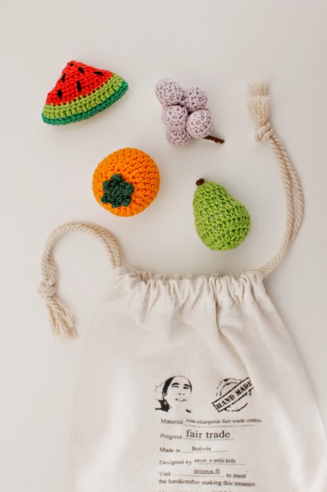 Tänk juu työkaveri, vauva sai niin söötit lelut! Nämä jos jotkut ovat reilun kaupan hedelmiä, kiitos Mum’sin.