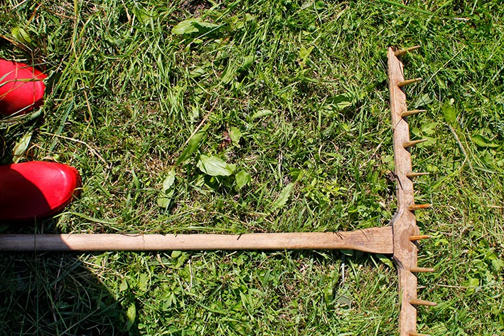 Muutettiin nyt toviksi maalle, tai ainakin perheen naisväki, kun isillä ei ole ihan näin pitkiä lomia. Aloitettiin loma kunnon maalaistöillä laventamalla pihapiiriä takaosan pellosta. Navetta on täynnä vanhoja työkaluja, joten täällä ihan oldskoolisti viikate heilui, puuharavalla kasaan ja kuivumaan. Tuossa on nyt sivallettu puhtaaksi sellainen 5 x 30 metrin ala ja hullun hommaa. Pisteet ropisee entisajan maamiehille ja -naisille. Plus, että niillä on ollut älytön paarmojen sietokyky.