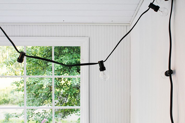 Sähkömies asensi verannan kattoon pistokkeen ja saimme karnevaalivalot kattoon. Iltoihin pimeneviin, vaikkei niitä nyt kukaan odota. Aikun ois kesä ainainen.