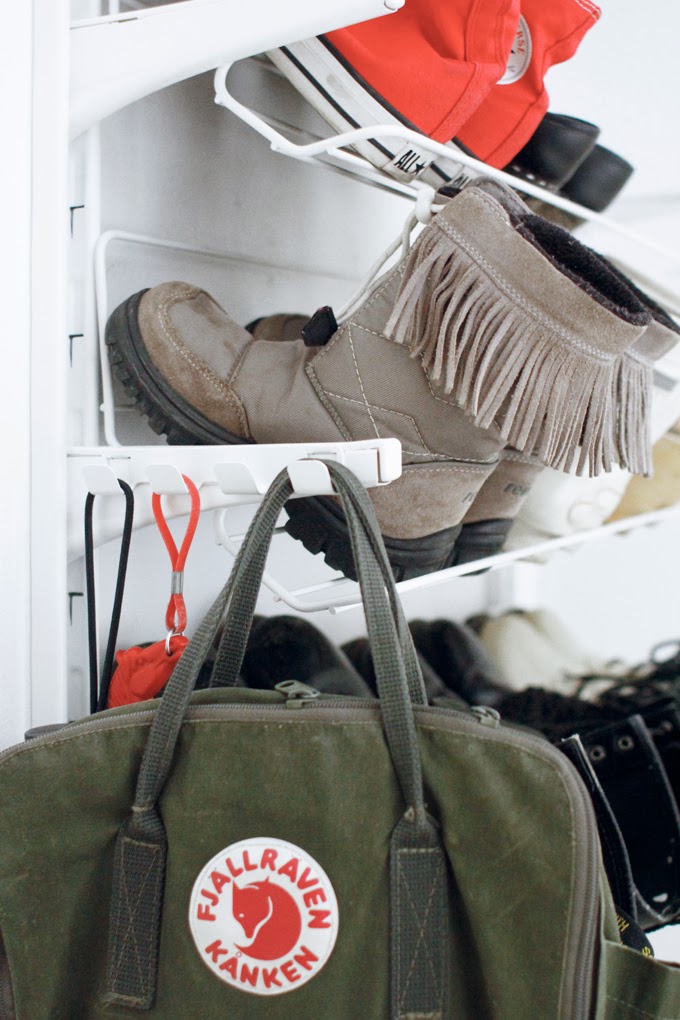 Siivouspuuskassa inventoimme kaikki perheemme kengät. Mua ärsyttää, jos kenkiä on eri paikoissa, kun silloin moni pari jää unoholaan ja pitämättä. Nyt päätimme viedä pienet ja pitämättömät kiertoon, vialliset suutarille ja sitten laittaa järjestykseen ne kaikki oikeasti arkikäytössä olevat. Eteisemme on pieni, mutta toisen oven takaa löytyi hyvää tila. Hankin sinne Ikean Algot kiskot, lyhyitä kannattimia, kenkätelineitä, parit koukut ja muutaman avohyllyn ihan pikkuisille kengille. Tuolla nuo pysyvät nyt siististi oven takana ja kaikki kuitenkin kätsysti saatavilla. Ja nyt voi helposti imuroida ja luututa hyllyn altakin. Taputus olalle, hyvä äiti!