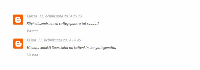 Onneksi olkoon Laura, sinulle tulee Mainio clothingin collegeviitta ja onneksi olkoon Liisa, sinä saat ruudukkaan oloasun. Laittakaa minulle sähköpostiin kokotoive ja postiosoiteenne, niin saadaan paketit matkaan.