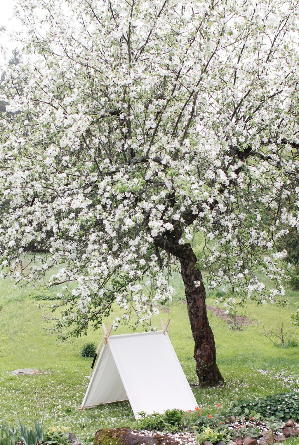Terveiset maalta. Vielä ehdimme ihastelemaan omenapuun kukinnan. Kasasimme heti miten sen teltan, josta jo vähän kertoilin. Jos nurmi olisi kuivempi, oisin saman tien mennyt makoilemaan terälehtipeitteelle. Kesällä sitten. Tuon alla on hyvä varjo myös vauvalle. Kaupungissa tein siitä myös sänkykatoksen, laitan kuvia pian. Nyt saunaan, huomenna jatkuu metsästysleikit.