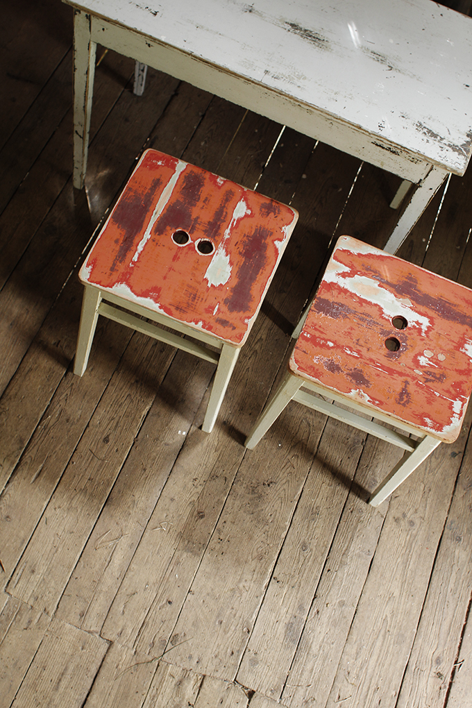 Nyt heti alkuunsa laitan tämän sävyn jakoon, monasti kun kysellään sitten aikojen päästä koodia ja siinä vaiheessa on jo purkit roskiksessa sun muuta. Löysin nimittäin niin kauniin harmaaseen taittavan tumman vihreän. Varsinkin himmeässä maalissa todella hieno sävy. Ollaan nyt tyhjennetty vanha puuliiteri ja aloitettu siitä uuden kesähuoneen teko. Kolusin navetan yläsiltä viimeiset mökkikauppojen mukana tulleet vanhat kalusteet. Ajateltiin, jos niistä kunnostettaisiin mööpelit uuteen huoneeseen. Kolme jakkaraa sai juuri tuosta vihreästä uudet kannet. Nätit tuli.