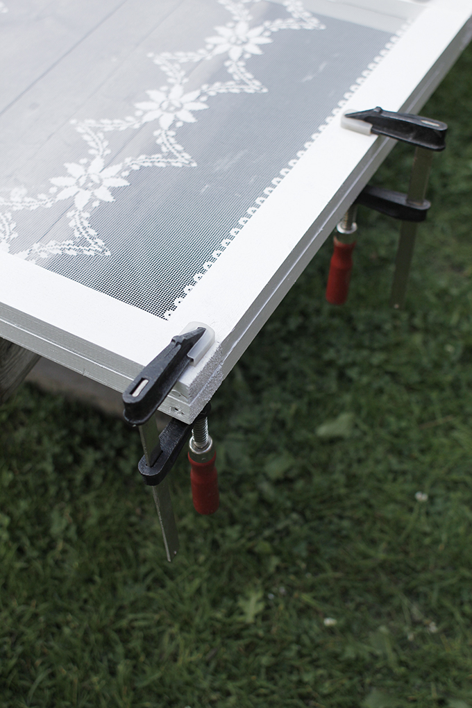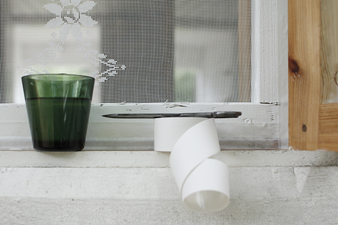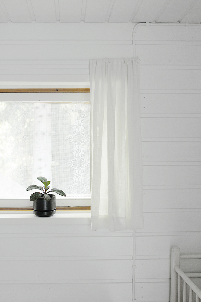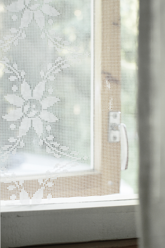Pistin tänään pienemmän päiväunien aikaan töpinäksi ja näpräsin nopsaan tuollaisen hyttysverkon meidän kesähuoneen ikkunaan. Puurimasta kaksi ikkuna-aukon kokoista kehystä, maalasin ne Helmi-maalilla (kuivui nopeasti) ja leikkasin vanhasta pitsiverhosta sopivan kokoisen palasen. Se liimalla kiinni ja kehykset yhteen. Ikkuna-aukkoon sen saa tiiviisti muutaman huopatassun avulla ja vedin tuonne ulkopuolelle vielä liimapaperinauhan, niin ei mahdu imijät sitten mistään. Nyt nukkumaan ja ikkunat sepposen selälleen.