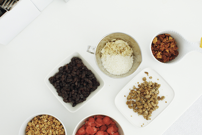 Itse tein kahdenlaista mysliä, joissa molemmissa oli sama pohja: kaurahiutale, kookos, manteli ja vaahterasiirappi. Toinen sai lisukkeeksi pakastekuivattuja mansikoita ja mulperimarjoja, toinen kuivattuja omenoita, rusinoita ja papaijaa. Ihan hullun hyvää.