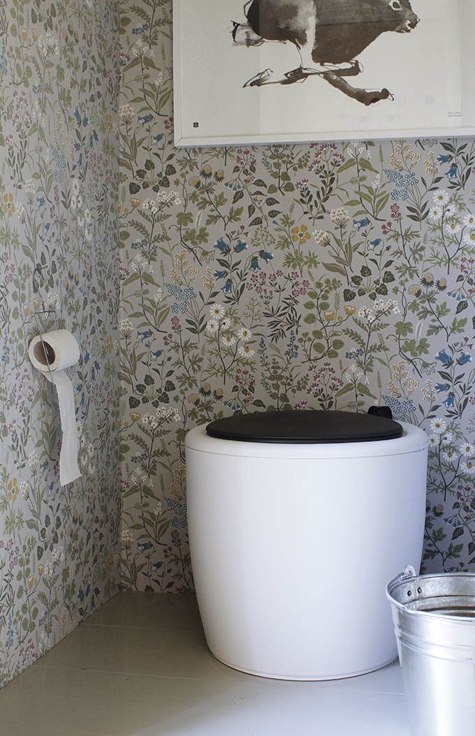 Tänä aamuna tehtiin vessasta sitten vielä vähän kivemman näköinen. Tähän meidän kukkivaan mökkityyliin löytyi Värisilmän uusi Jubileum Flora -tapetti. Pari rullaa riitti pikkuvessamme verhoamiseen. Sitten vielä pupujussi seinälle, papruteline ja kuivikeämpäri. Avot. Kelpaa. Ja helpottaa.