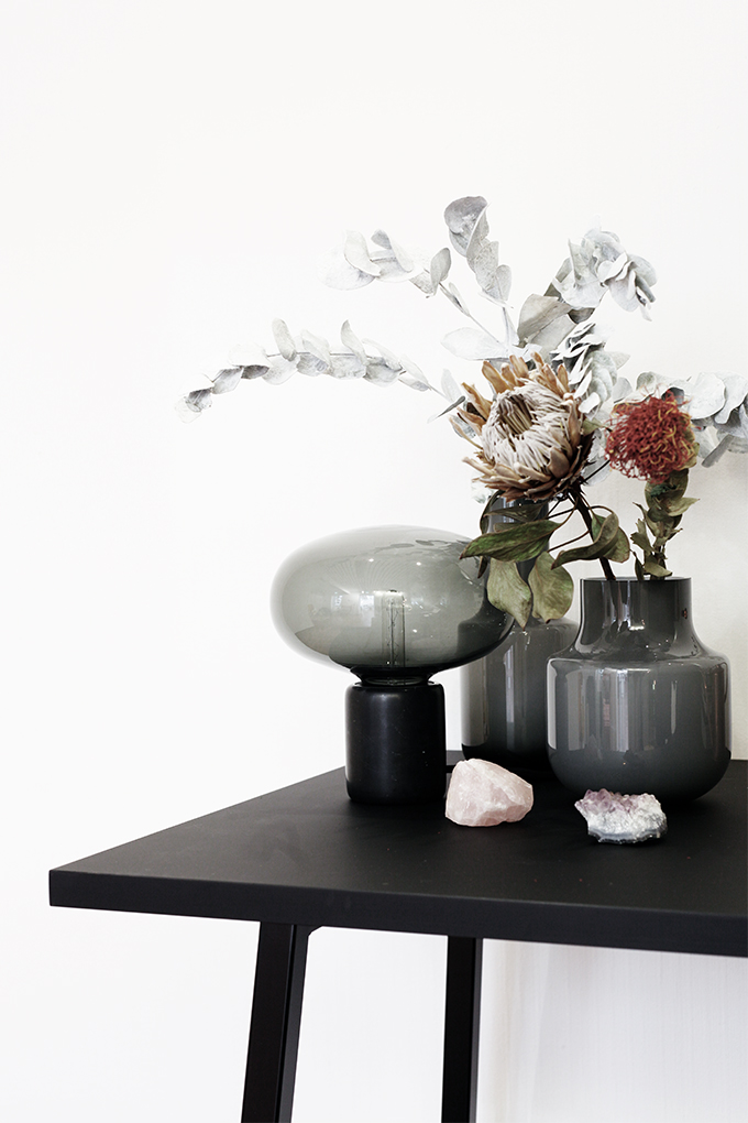 Swell-sohva, Amp-pöytävalaisin ja riippuvalaisimet, Knot-tuoli, Tablo-sivupöydät ja Still-vaasit, Normann Copenhagen.