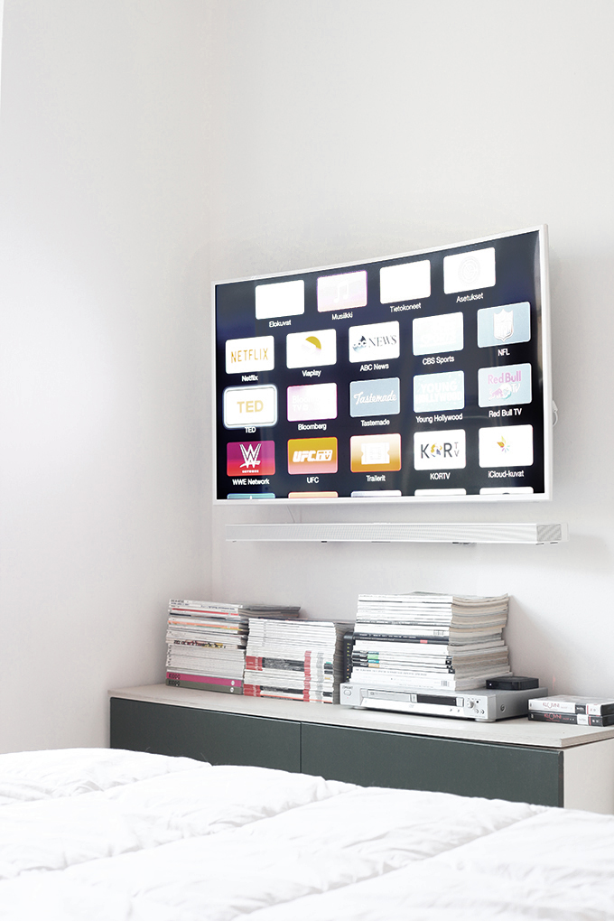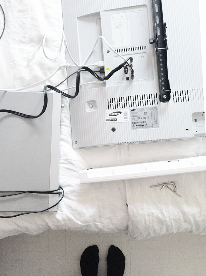 Ja se mistä tässä eniten reluan, on asentaminen ja kytkeminen. Ihan yhden naisen voimin tv nousi seinälle, johdot oikeisiin liittimiin ja kaikki herkut sain käyttöön ilman tappeluja. Uuden seinätelineen hain Olhsonilta ja kaksi uutta piuhaa (tv->kaapelimodeemi ja tv->dvd-soitin) – kaikki muu tarvittava oli paketeissa. Nyt vörkkii yhteen niin tv, dvd kuin apple tv.