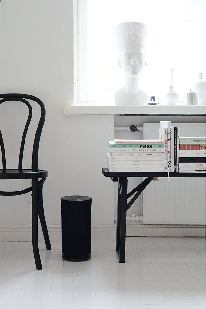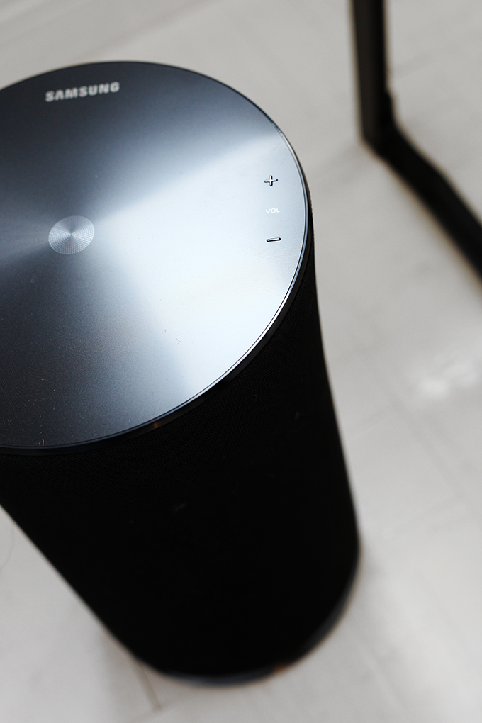 Eikä siinä vielä kaikki. Kaaritelevision rinnalle sain kaarevan Soundbar-kaiutinjärjestelmän (kaareva kaiutin tv:n alla ja subbari lattialla). On kuulkaas aivan toinen äänimaailma nyt ja ei ole niitä silmiin sattuvia pylväskaiuttimia siellä täällä ympäri huonetta. Istuu saumattamosti tv:n yhteyteen ja kaikki kauniin valkoisina. Ja jotta ihan överiksi menee, olohuoneeseen tuli vielä vielä langaton 360 Multiroom -kaiutin, joka soittaa musat puhelimesta ja läppäriltä. Ja iPhone naisena ei huolta yhteentoimimattomuudesta – puhelimeen ladattiin Samsung Multiroom appi ja Spotify sun muut soivat ongelmitta näiden kahden laiteperheen välilläkin. Täys kymppi. Olen myyty!