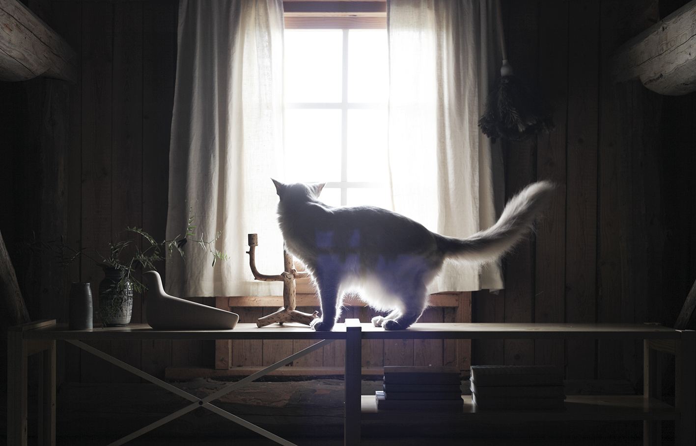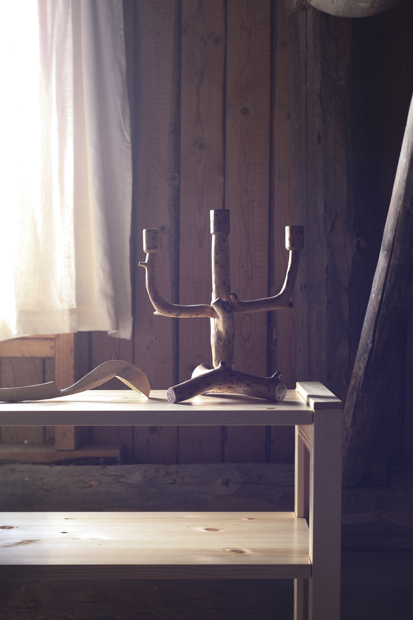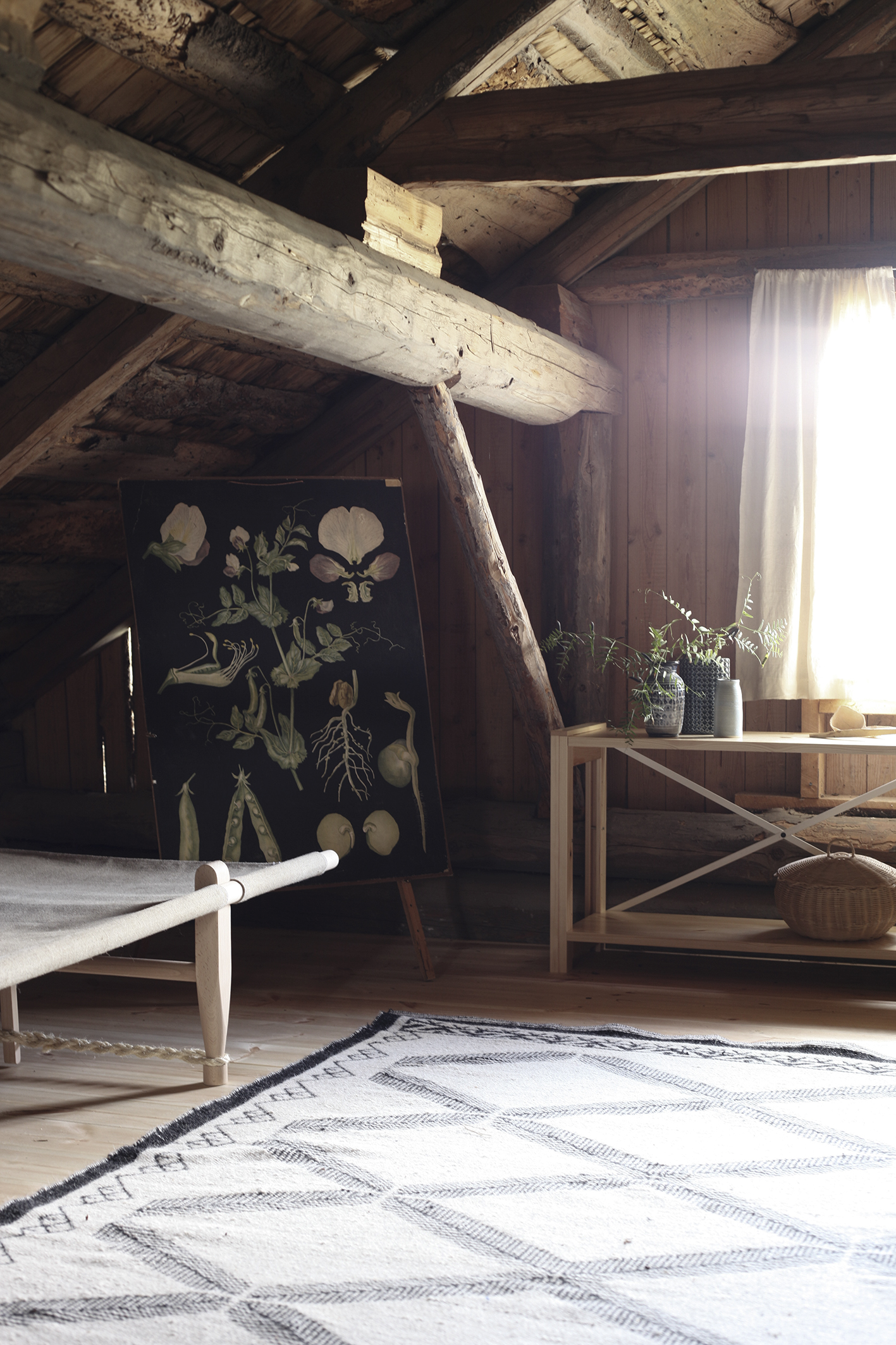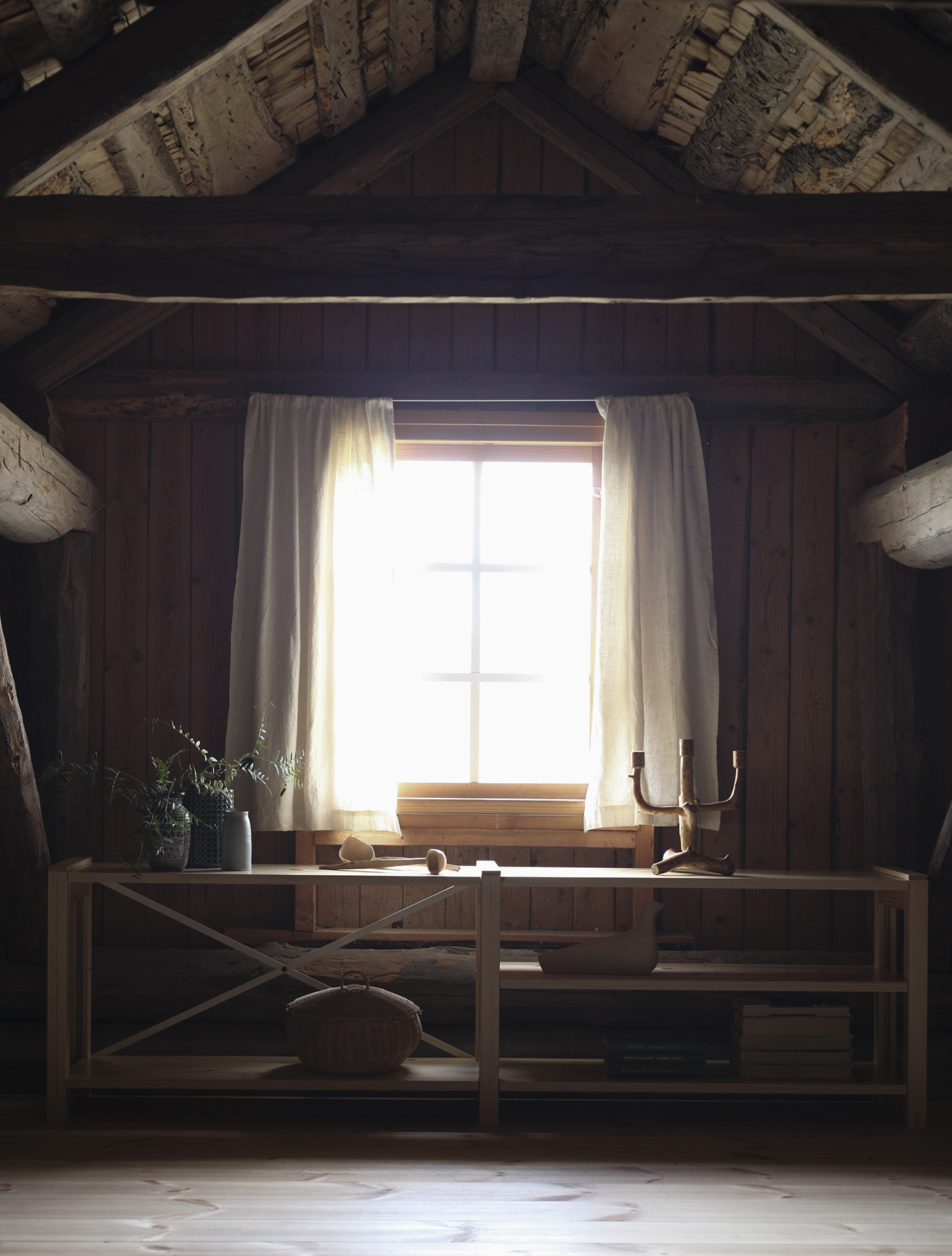 Matala Lundian avohyllykkö kulki osasina ylös helposti ja mallailin sitä täällä pariinkin kohtaan – sivuseinälle sängyn jatkoksi tai sitten tuohon ikkunan eteen, johon se taitaa nyt kyl jäädä. Ja tietenkin klassisen mäntyisenä, sopii tänne tupatunnelmiin kuin nenä päähän.