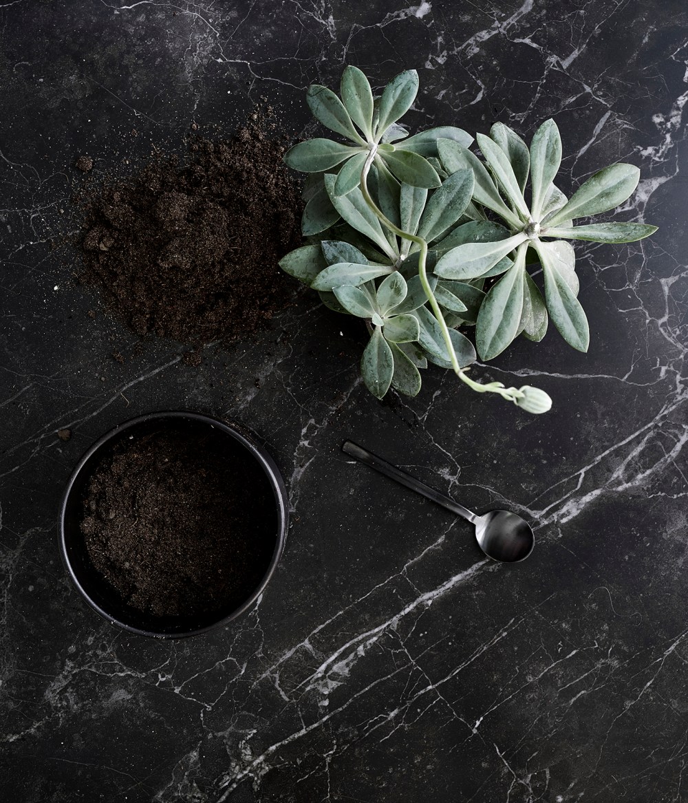4. Asettele kasvi uuteen ruukkuun. Lisää multaa paakun ympärille. Tiivistä multa kevyesti sormin painelemalla. Lisää vielä hiukan multaa. Kastele, niin että multa kastuu kokonaan. Näin multa tiivistyy juurien ympärille ja täyttää pienetkin kolot.