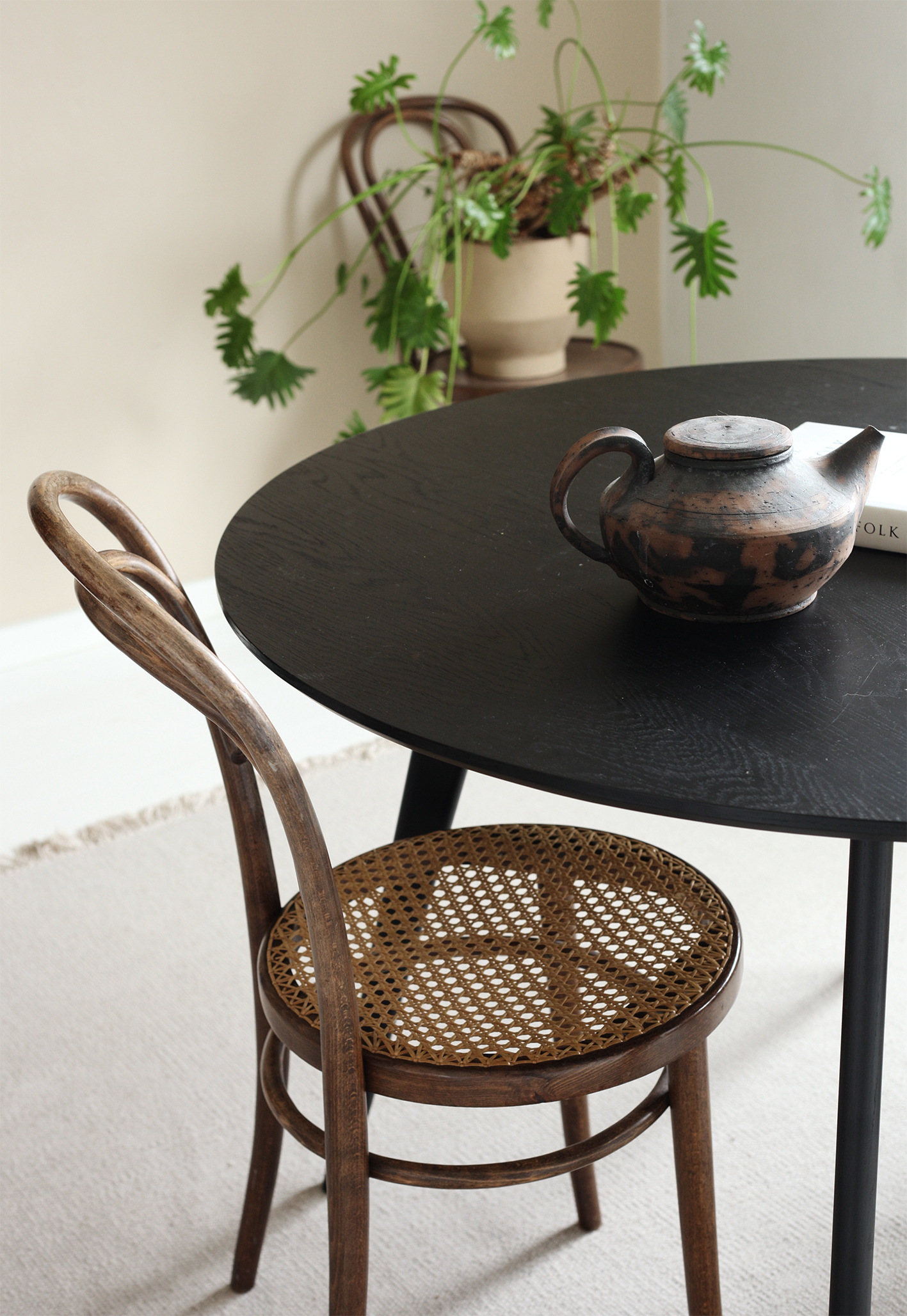 Minulla oli ollut hakusessa pyöreä ruokapöytä jo tovin, kunnes löysin sen meidän vanhan jatkettavan tiikkiviilupöydän. Viikonloppujen suurperhe kun ei mahdu ihan peruspöydän ääreen. Ennätin silloin pyöreän pöydän huumassa jo tilata Room21:sta mustan pyöreän, joka päätyi sitten assarini kotiin. Kävimme tänään tyttöjen kanssa sunnuntaikahveilla. Otin muutaman kuvan kalusteesta, se kun on oikein kelpo hinta-laatusuhteessaan. Saarniviilutetulla pöydän on halkaisija 115 cm ja ympärillä istuu kepeästi 4 henkilöä.