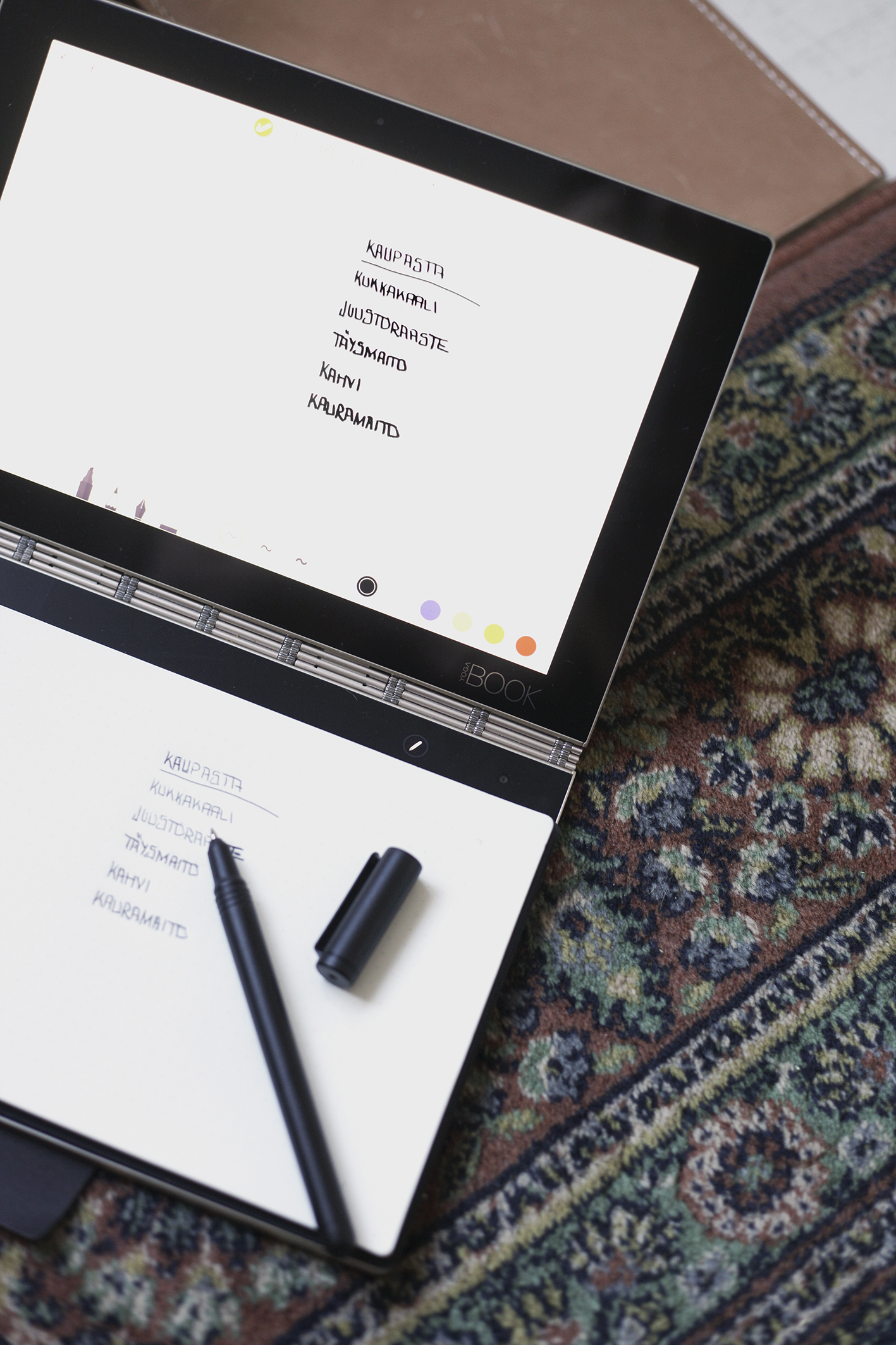 Pääsin onnekkaasti testailemaan Lenovon Yoga bookia, mikä on siis lyhyesti kuvailtuna tabletti, johon perustabletin lisäksi voi piirtää kynällä, mustekynällä tai vaikka sormella – perinteiselle paperille tai kiinteälle piirustusalustalle.